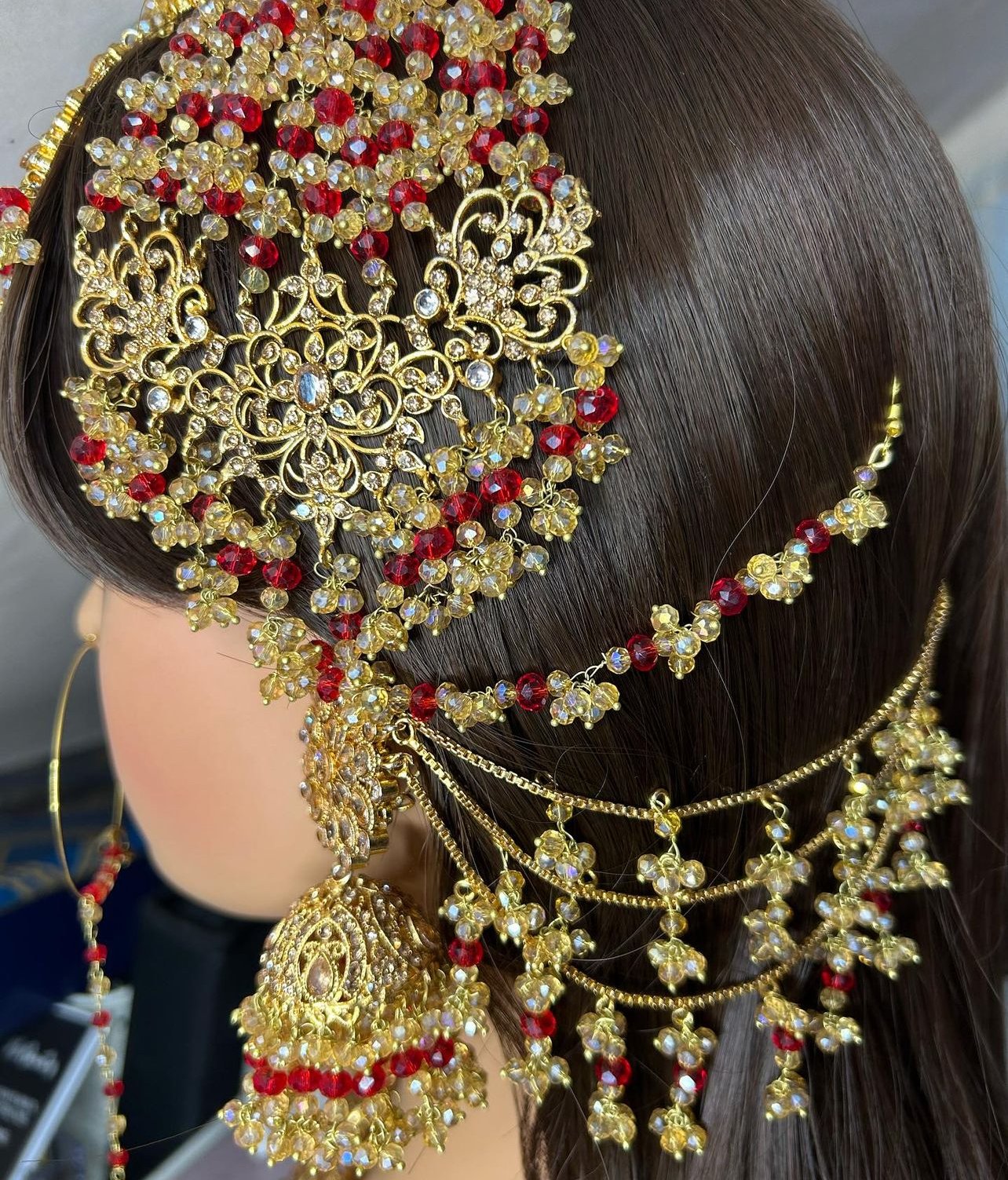 Maroon and gold coloured necklace set. Heavily beaded with intricate details. The Jewelery set had not been worn at all and is in new condition.