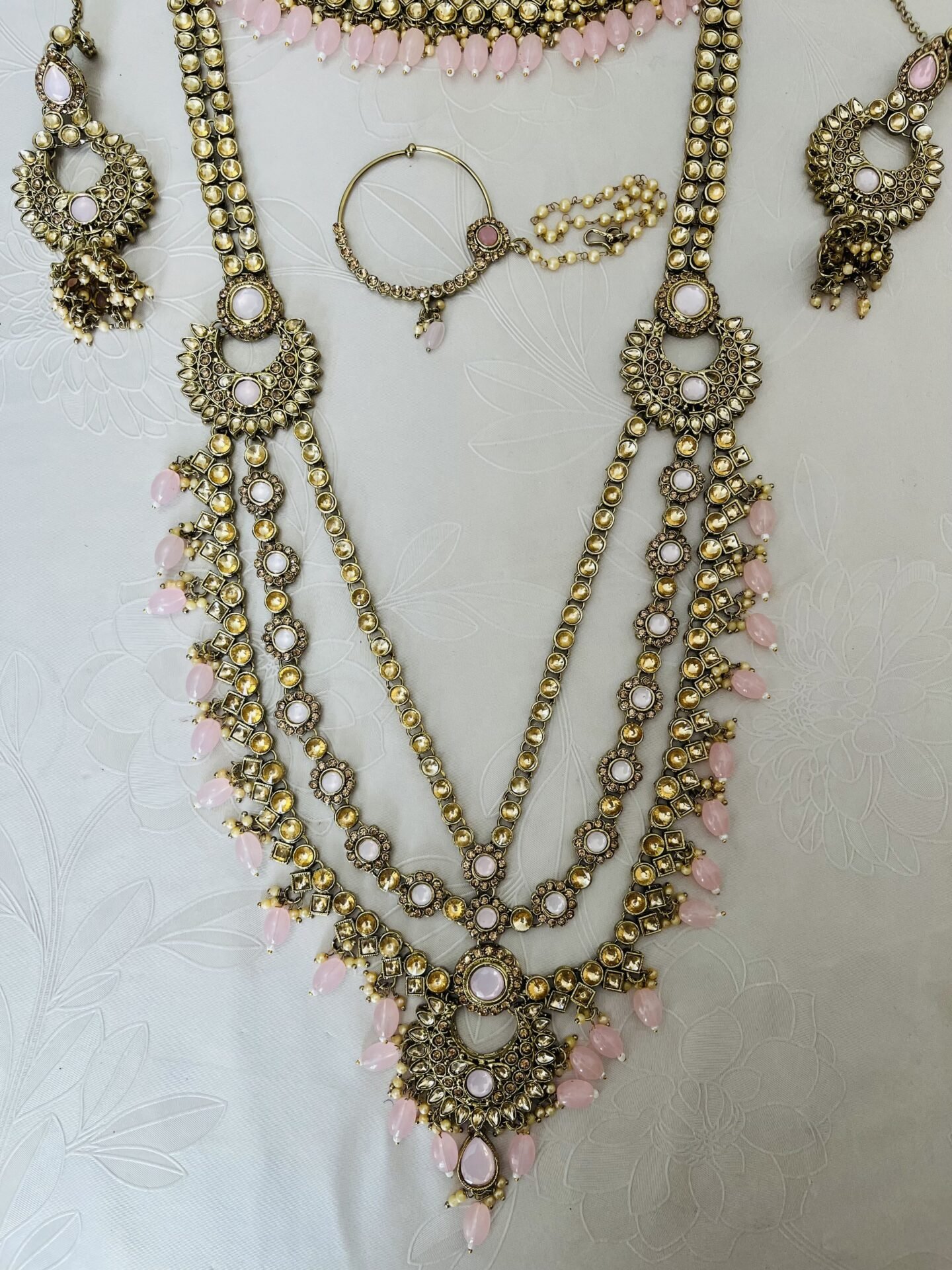 Gold and Light Pink Jewellery Set. Only worn once. All gems intact. Excellent condition. We have matching Lehnga outfit (Pistachio and Tea Pink Dupatta). No returns.