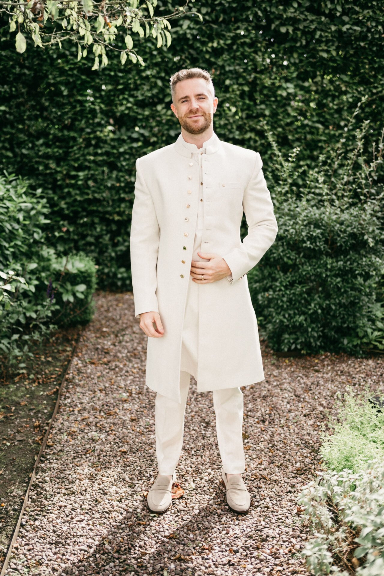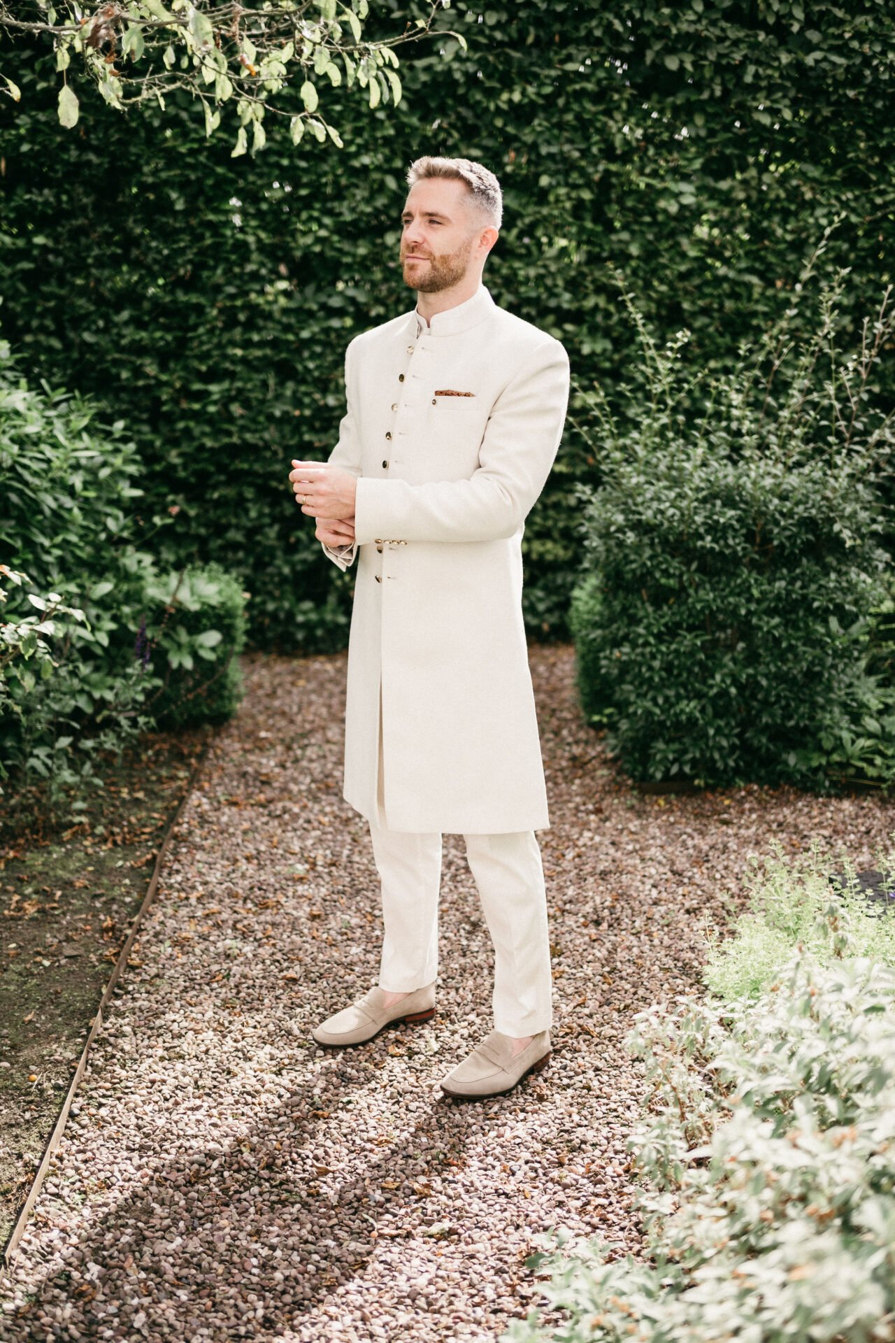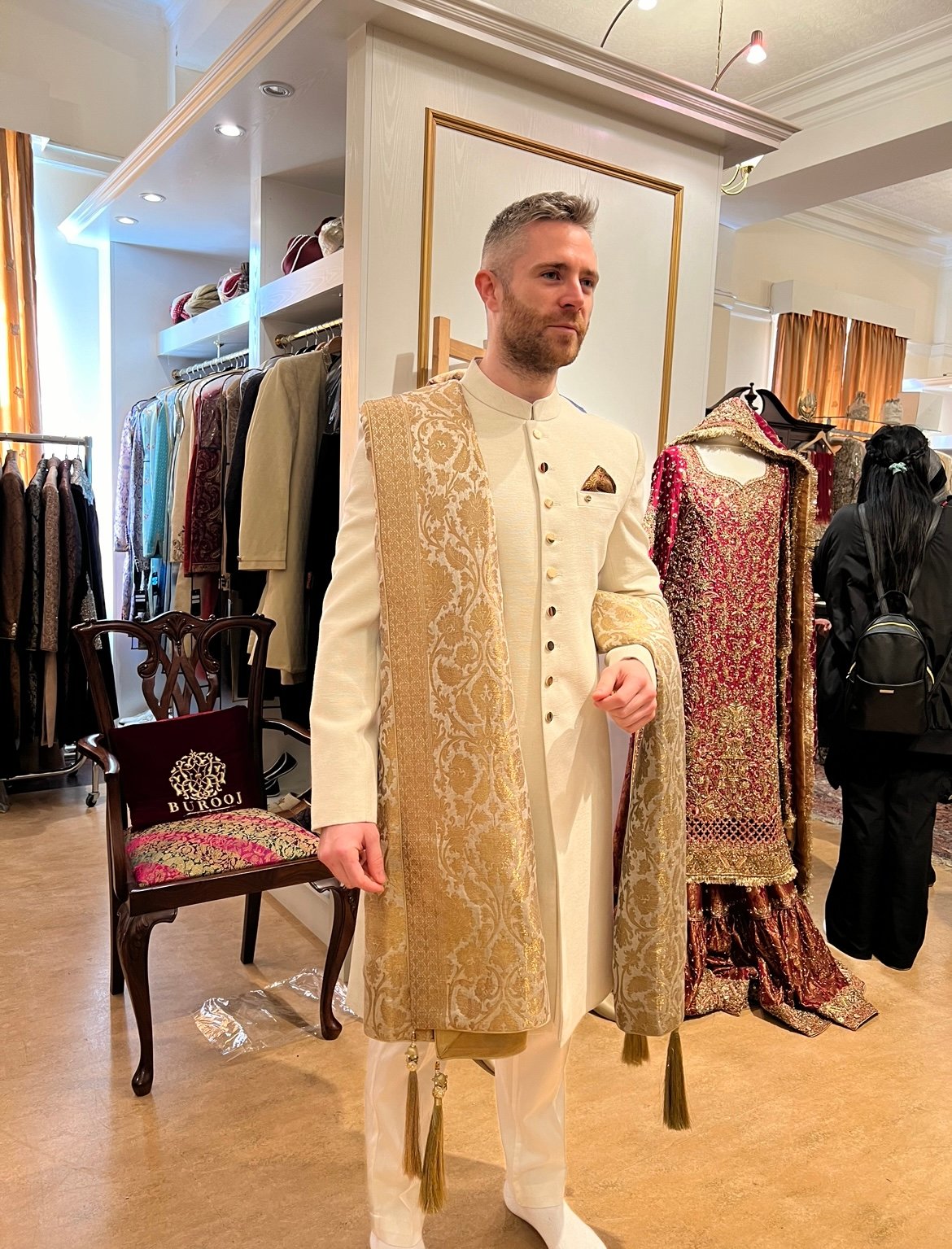 Custom made wedding grooms sherwani, cream with gold buttons. Would fit a size medium. Grooms height is 5”10.