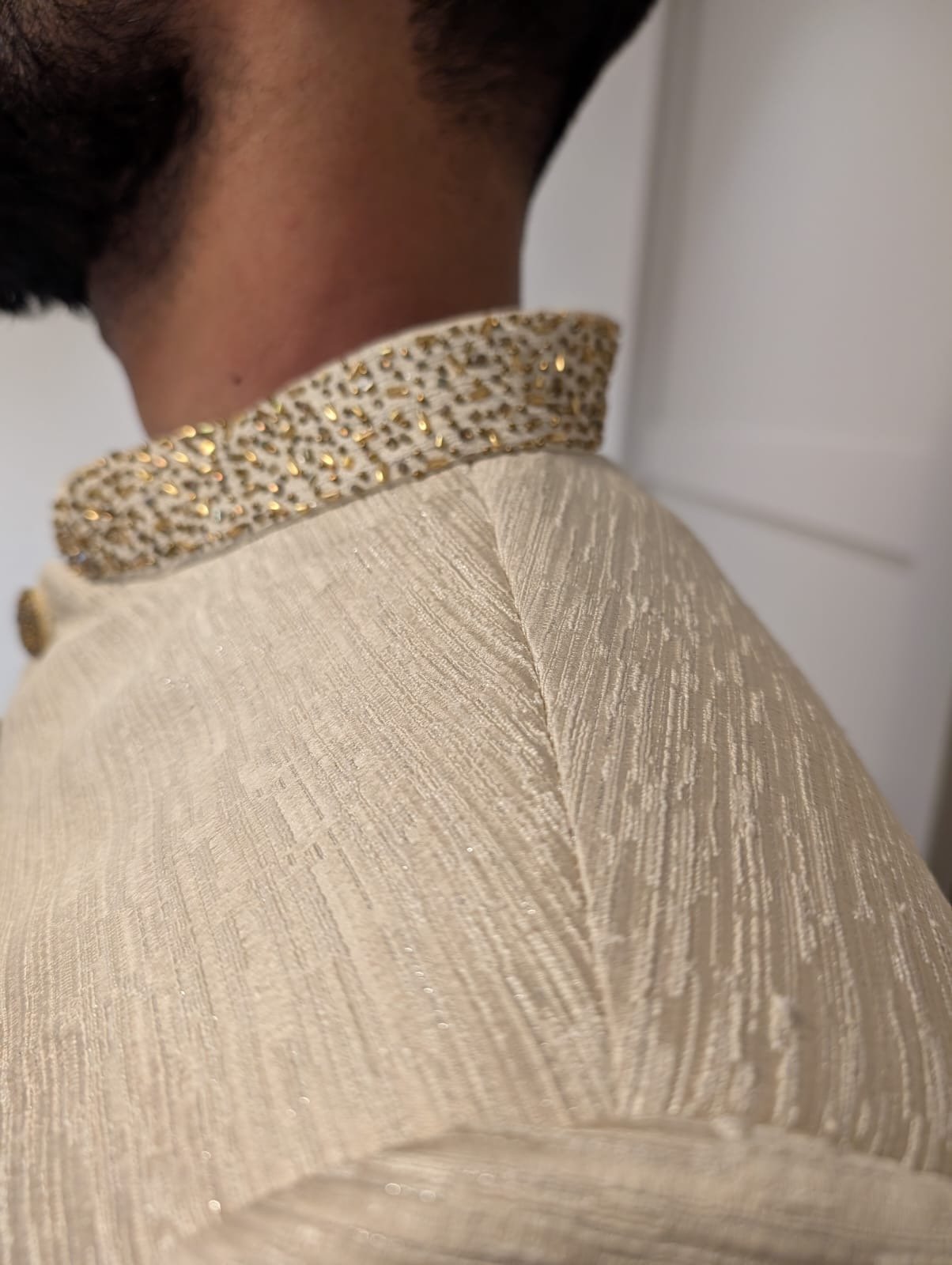 Cream off gold colour, gold work, cream trouser, bottle green drape