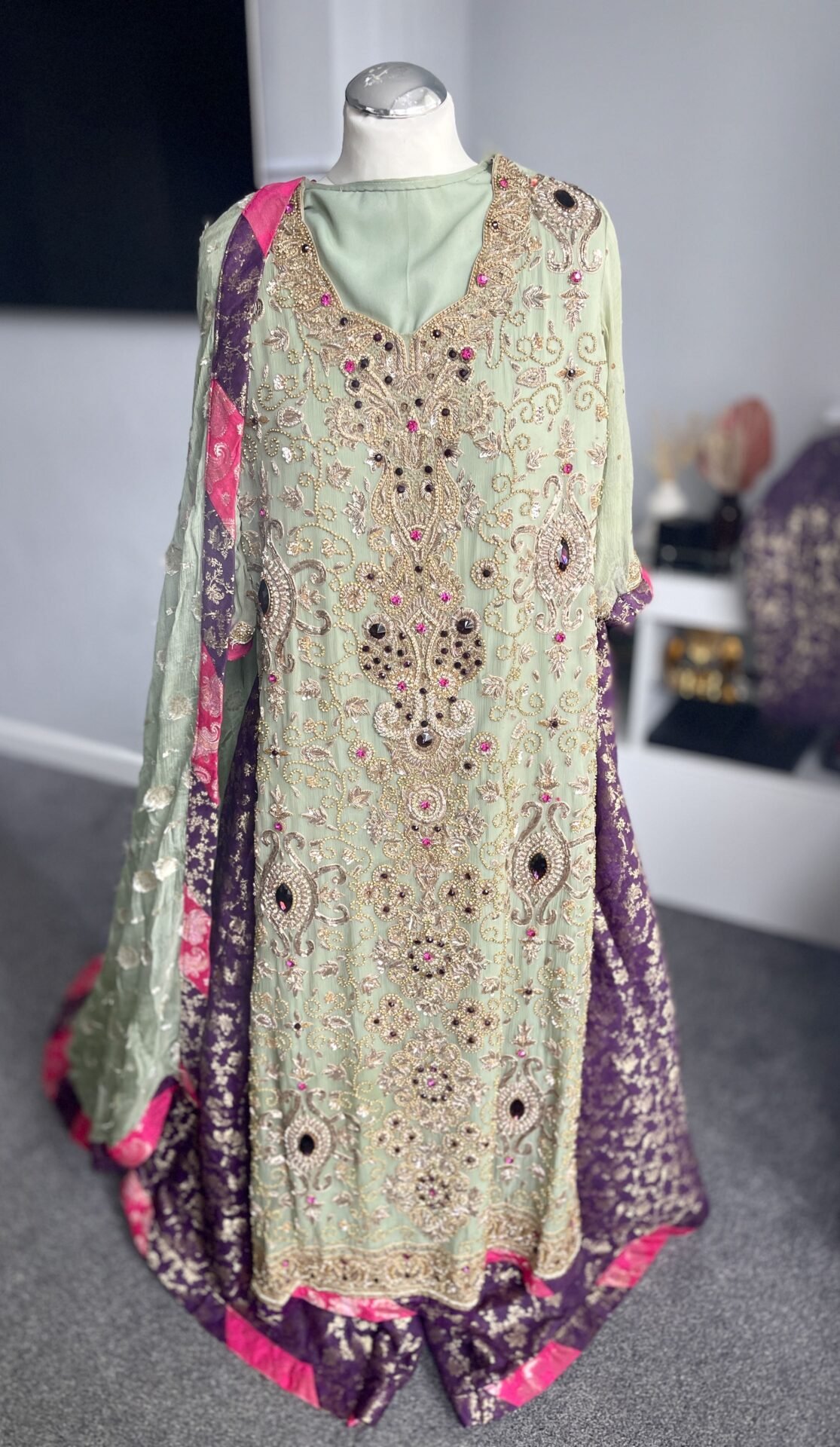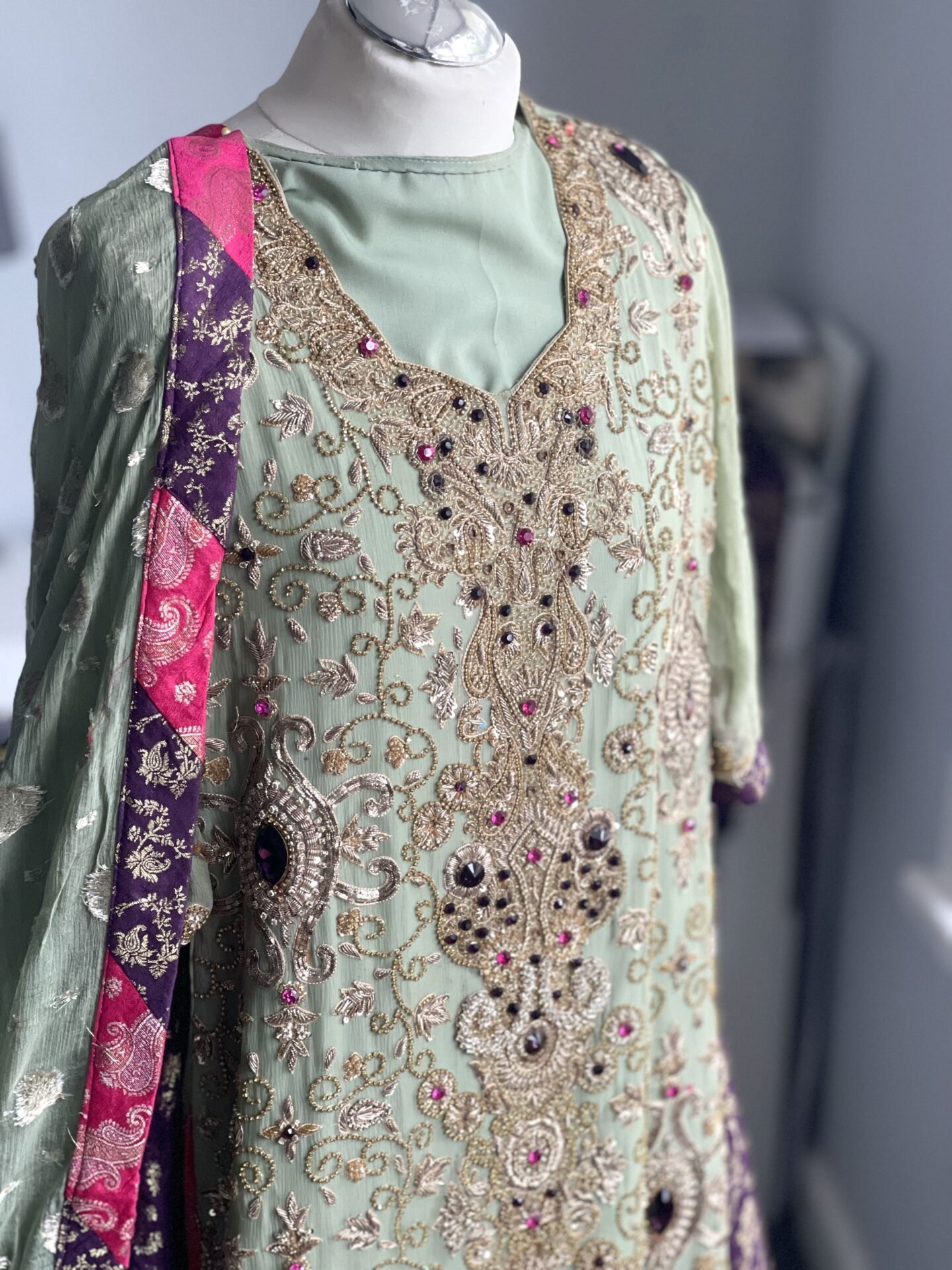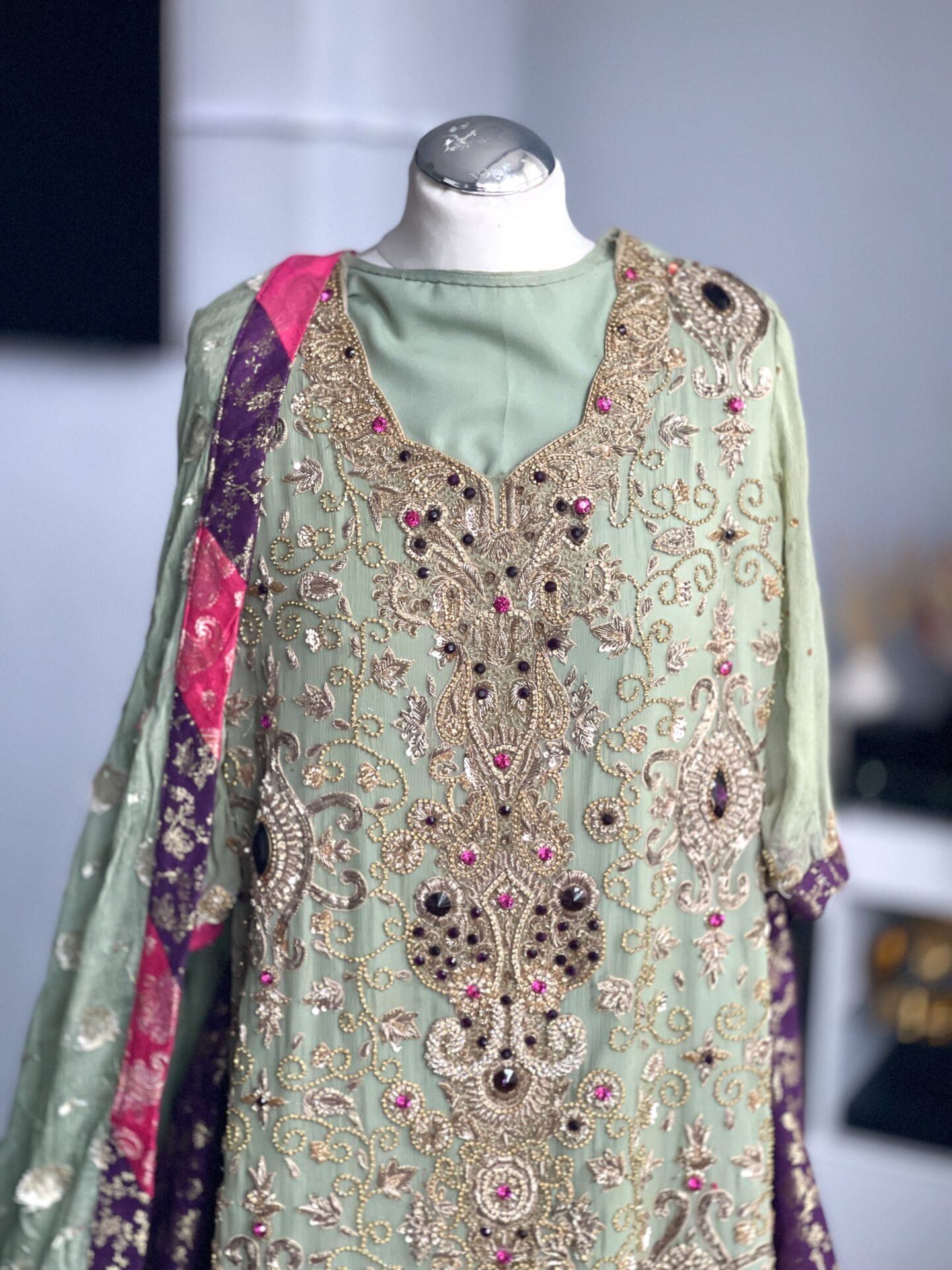 This is an absolutely gorgeous Pakistani suit with intricate detail and amazing hand work. The fabric is very delicate and has been embellished with rhinestones and gems.