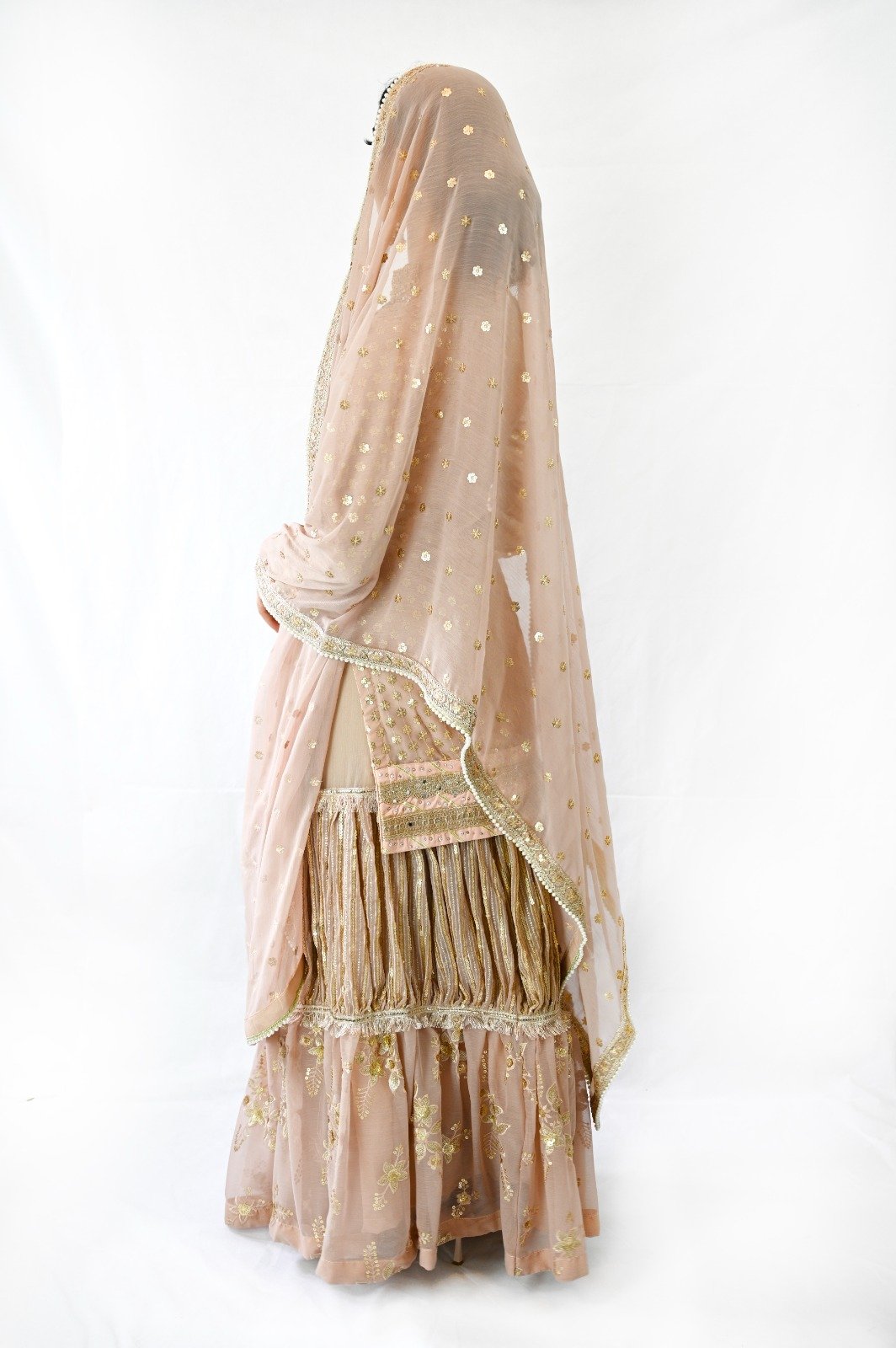 This 3pc set includes a beautifully embroidered knee-length chiffon Kameez, a ruffle layered chiffon lehenga skirt and a matching embroidered chiffon dupatta.
