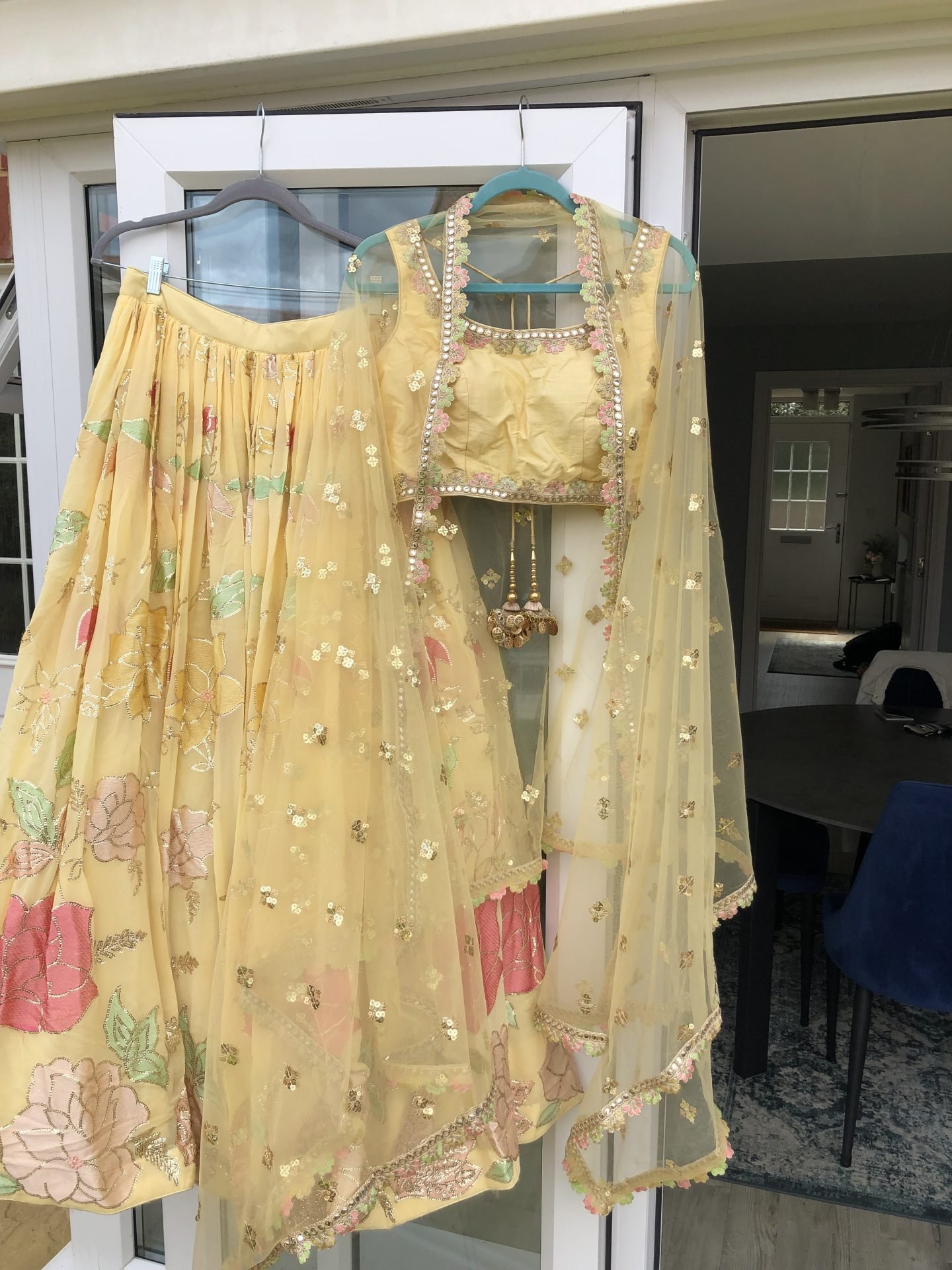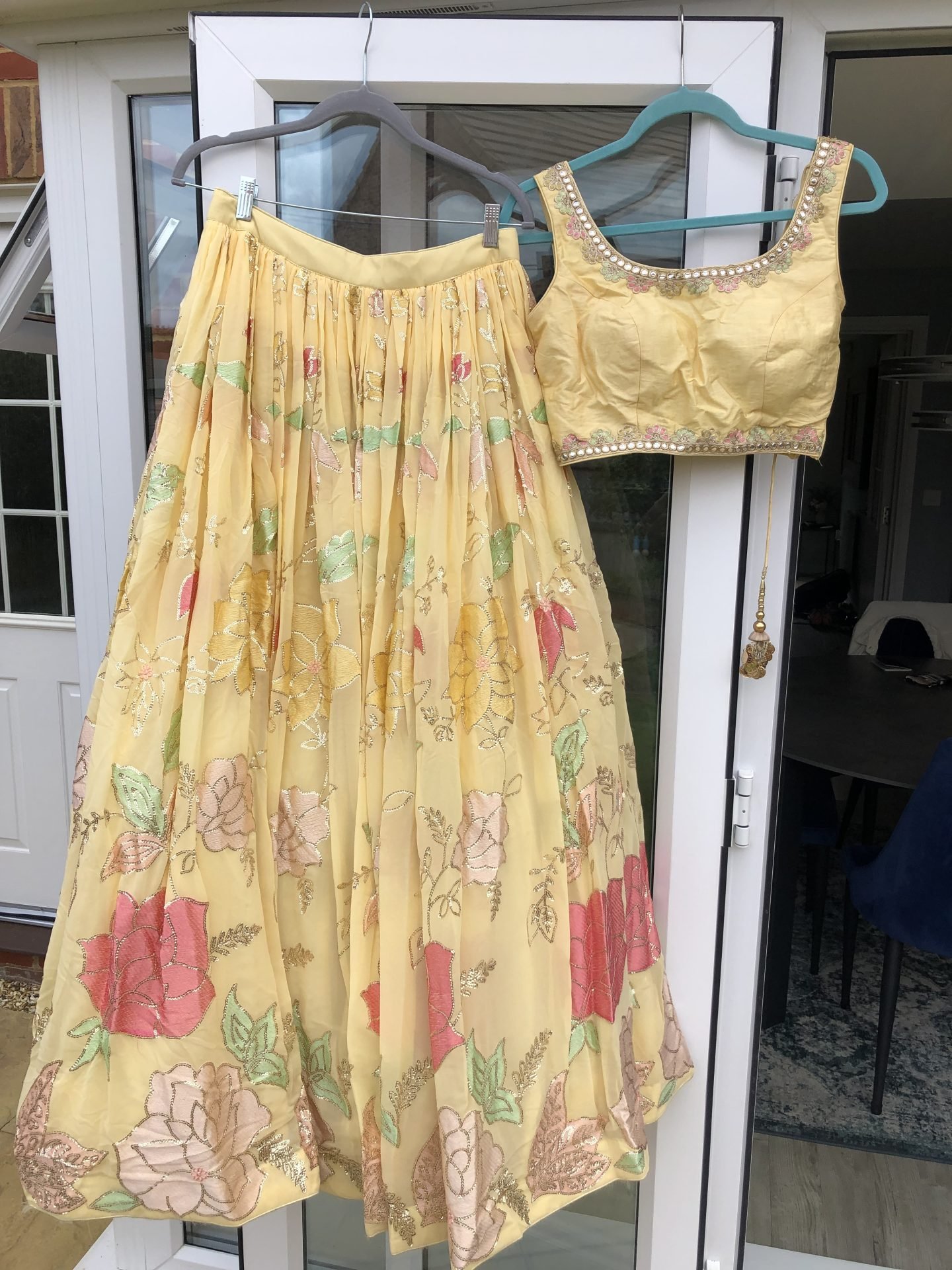 Beautiful pastel yellow designer Lehenga bought for £400 in Southall. Worn for few hours for sister’s wedding. Blouse currently fits a size 8 but has lots of room to adjust for a larger size. Realistic offers welcome. Up for sale on other platforms so please check before buying.