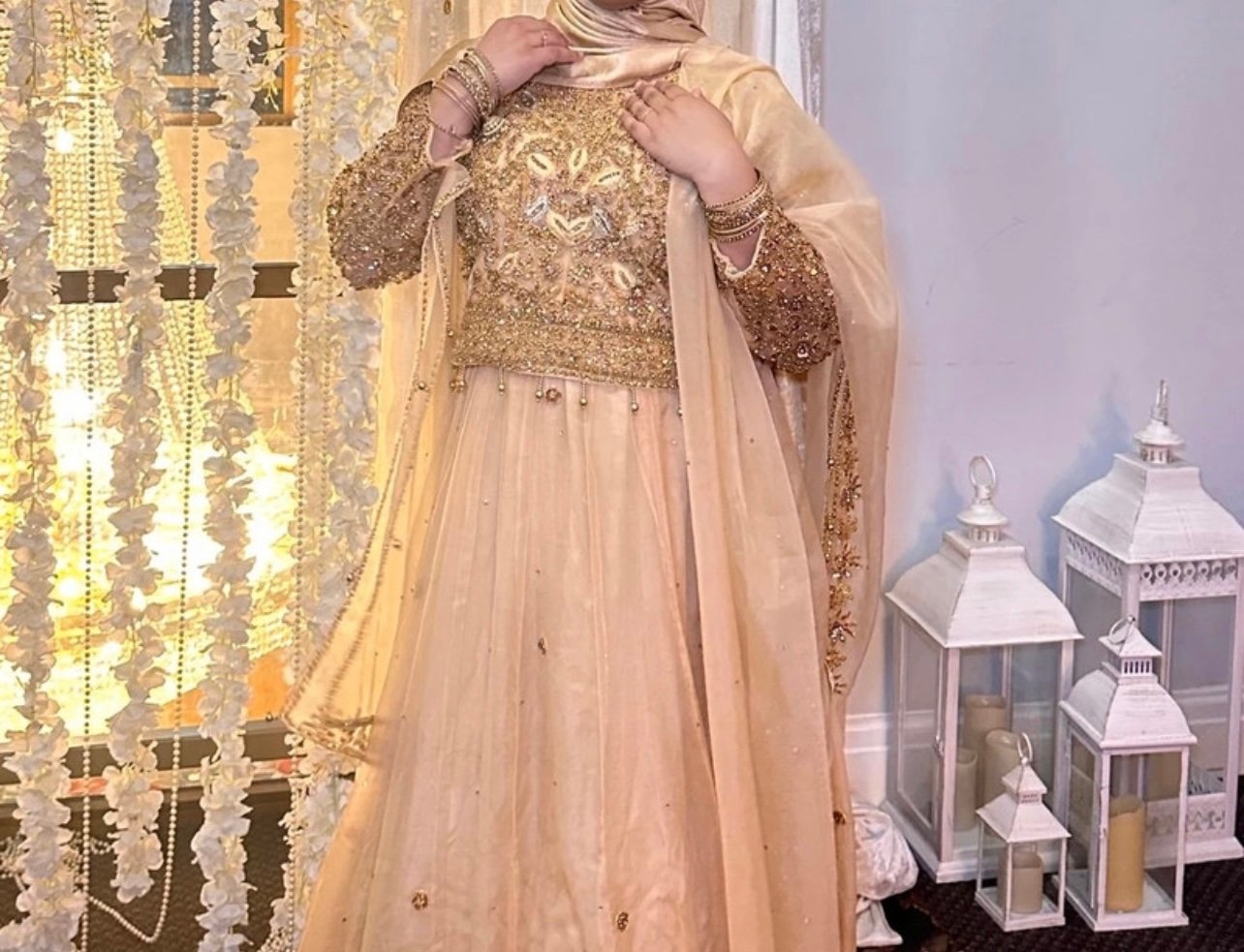 Light gold lehnga with dark gold embroidery and work. Comes with scarf, skirt and top. Comes in original dress bag it was in.