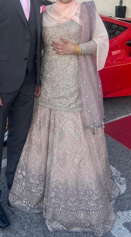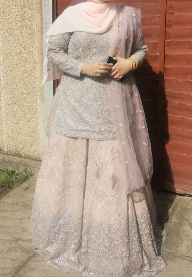 Majority of the outfit light light pink with a little bit of light purple at the bottom of the skirt it is a lehga with a slightly longer top. Only wore once. Brought made to measure from a well know shop mongas.
