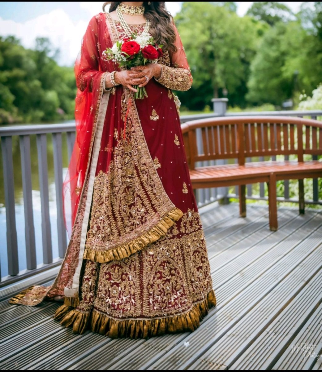 Pakistani Red Lehenga Dress for Wedding Wear has a deep maroon chiffon base, this traditional lehenga choli is handcrafted in zardozi work consisting of the kora, dabka, naqshi, with an elaborate jaal of cut dana all over the dress having the hints of crystals. with a heavily embellished dupatta perfect for weddings. The bridal Pakistani Lehenga is an amalgamation of modern and classical art.
