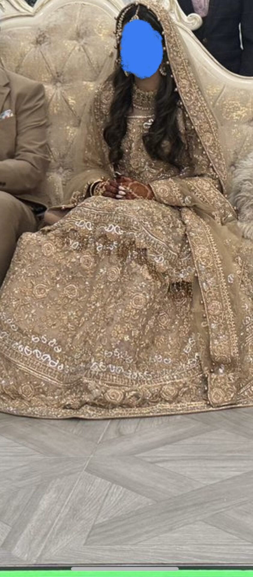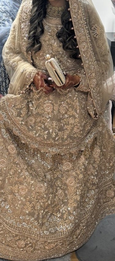 Floral rose embroidery with white gemstones and rose gold pearls. Peplum tailed blouse with matching lehnga. Only worn 5 hours. In excellent condition.
