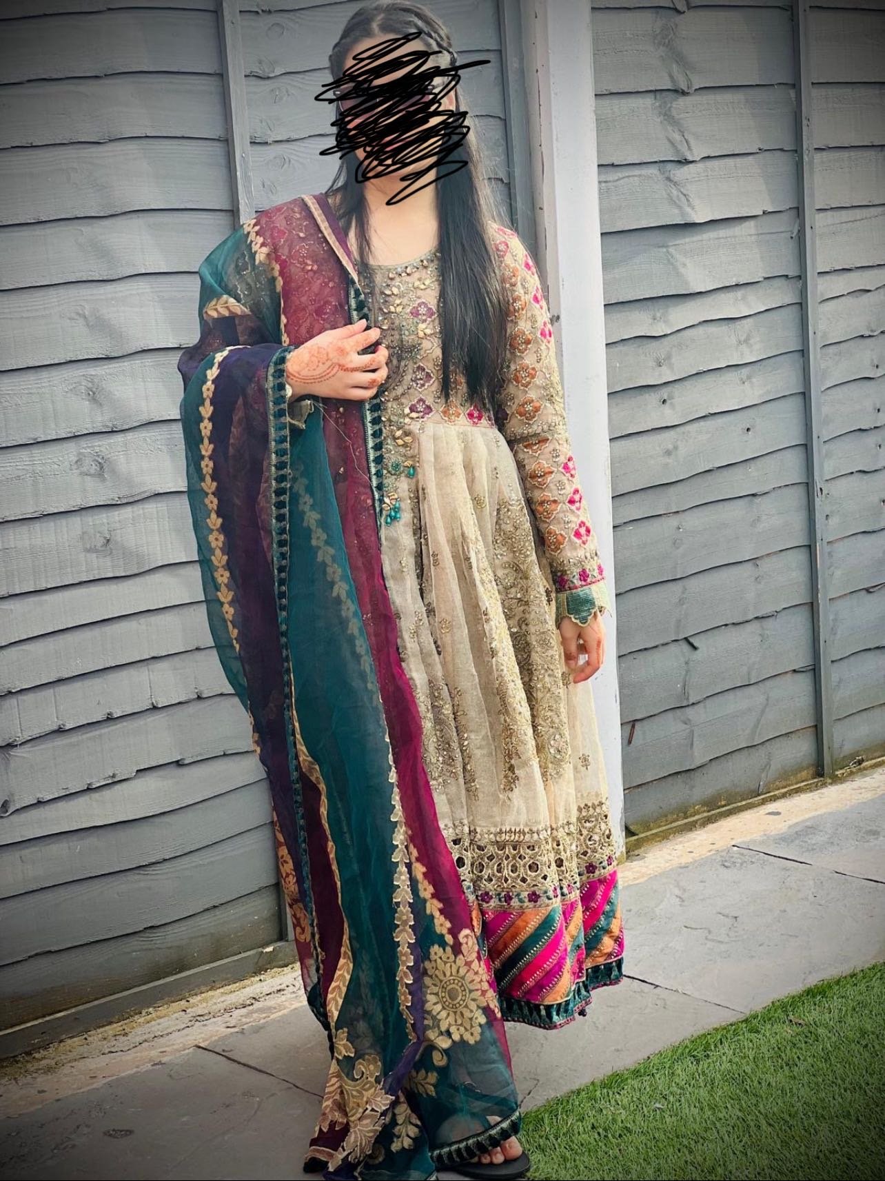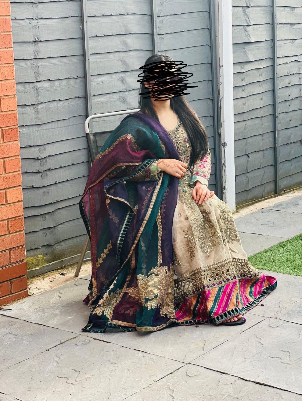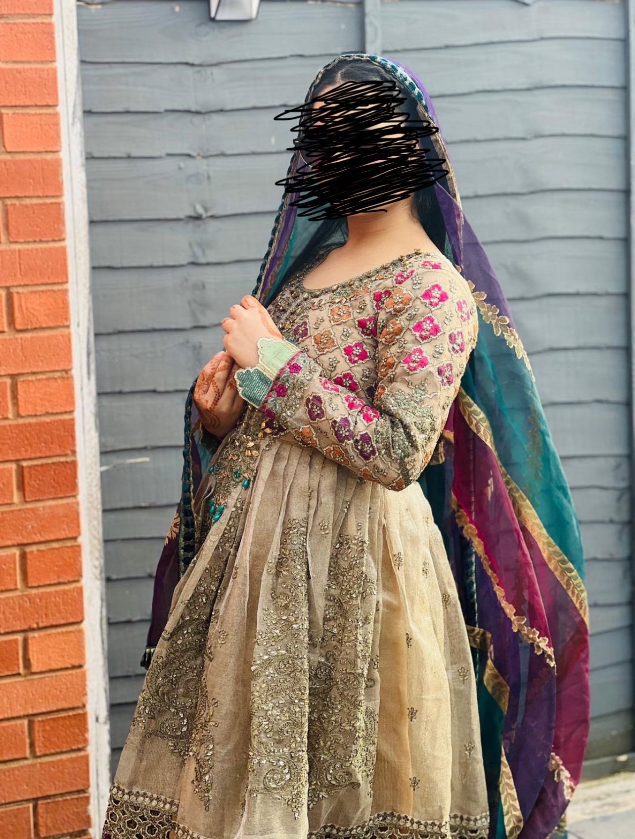 wedding dress bought Maria b dress from Liladuafit.com Only worn for about 6 hours. Trouser and duppata included. Size medium Gold long gown with beautiful embroidery, embellishments, kadai, intricate heavy work and gotta embellishments, and stone work, heavy daaman work, round neck, long sleeve, back embroidered, matching elasticated waist trousers, and wide width teal green organza dupatta with embellishments and border kadai.