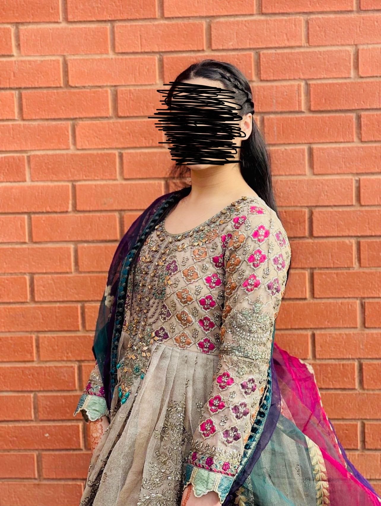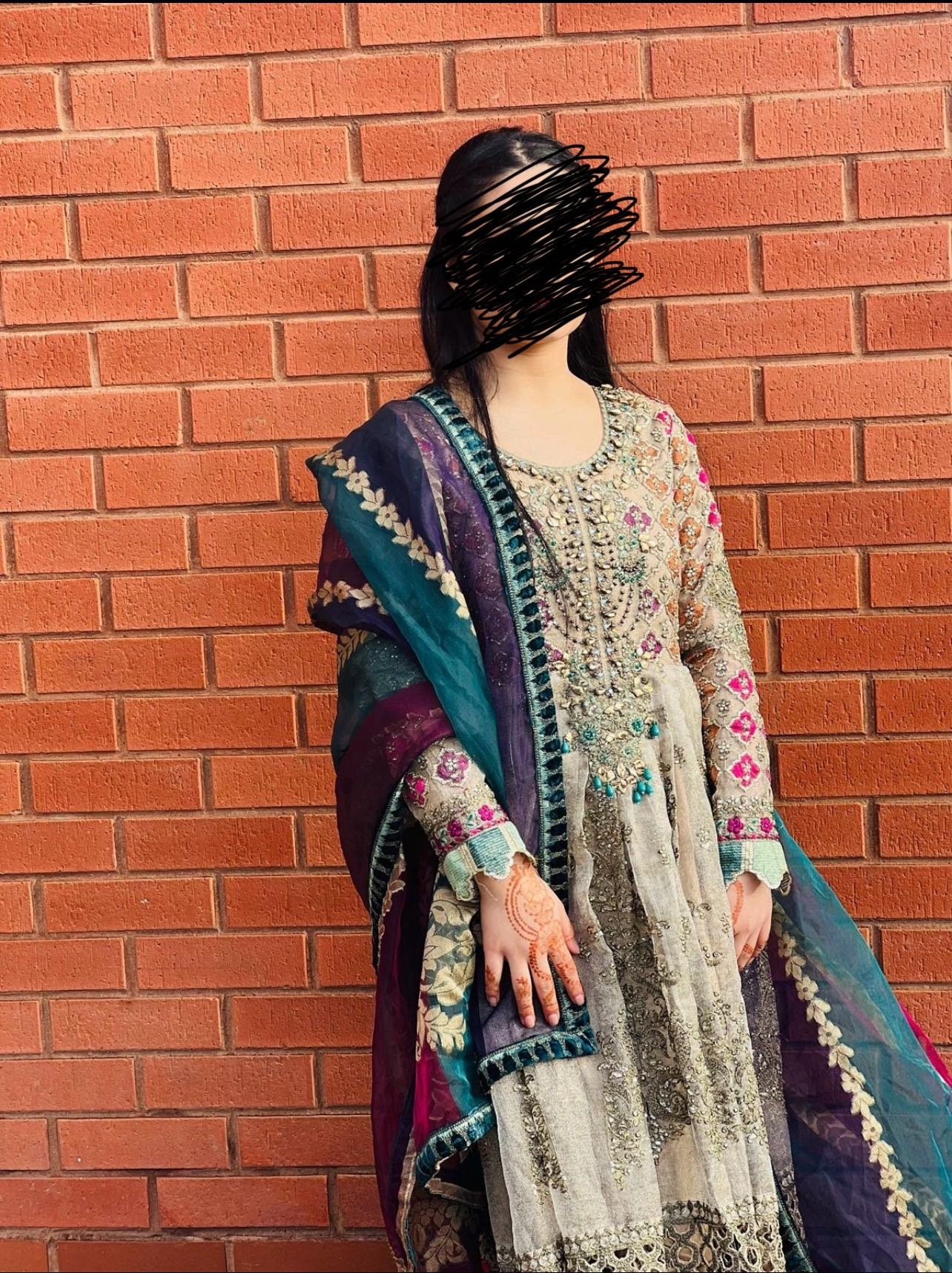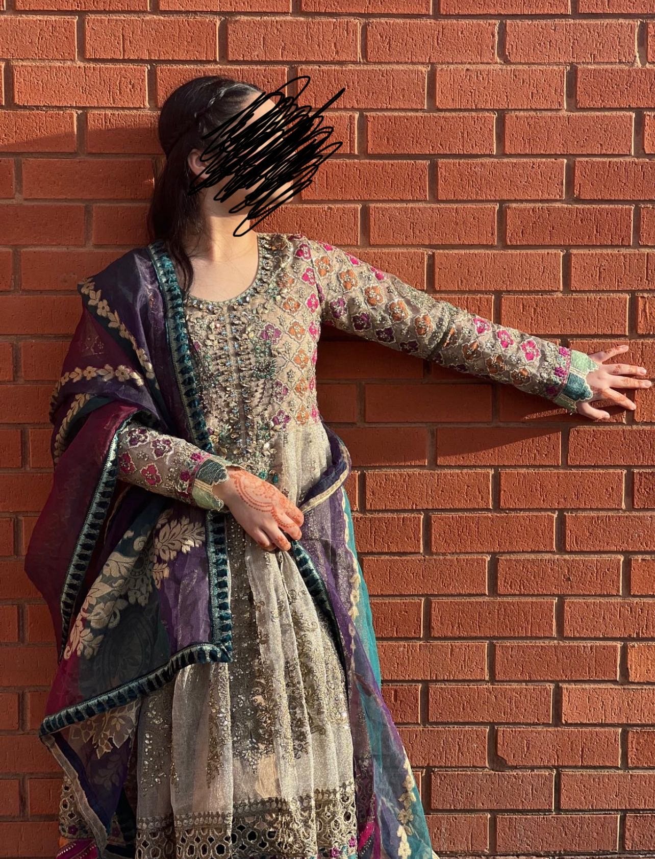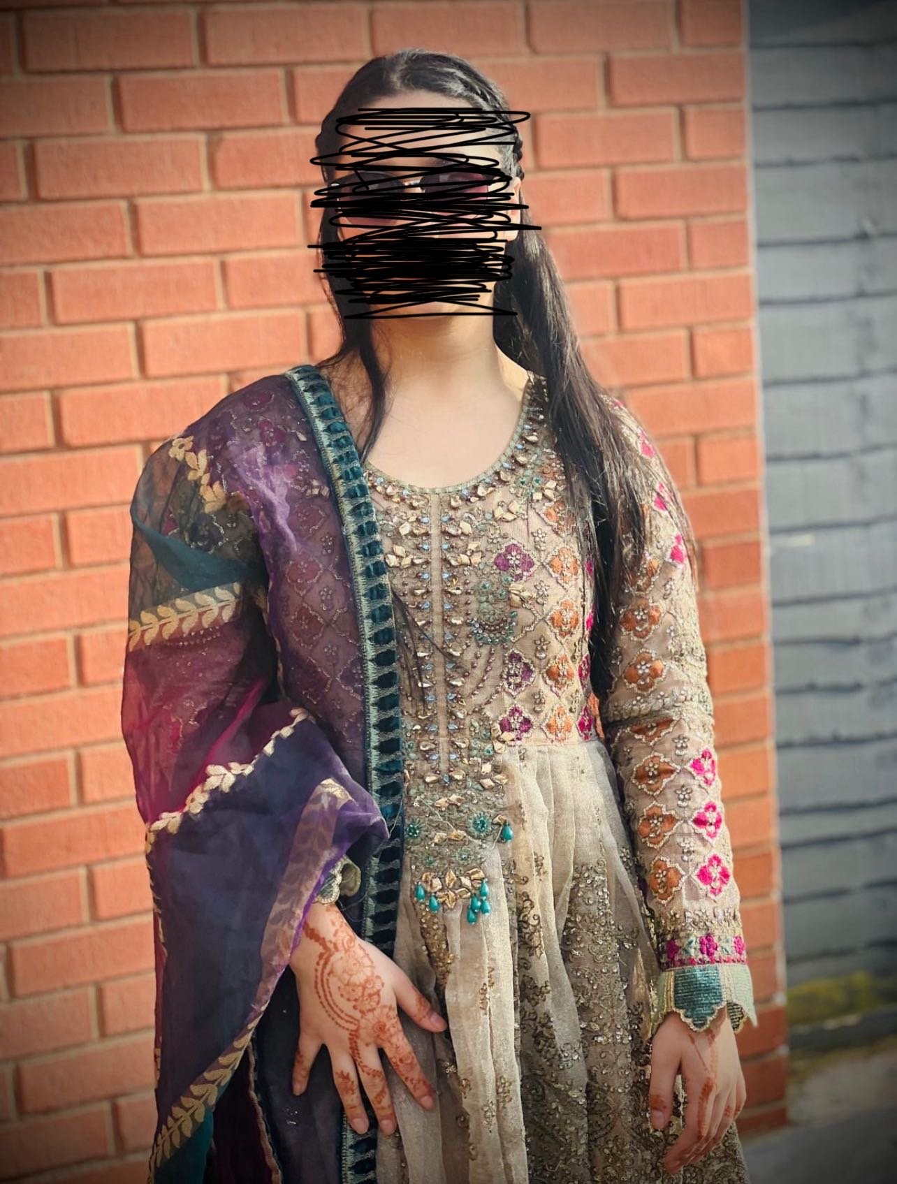 wedding dress bought Maria b dress from Liladuafit.com Only worn for about 6 hours. Trouser and duppata included. Size medium Gold long gown with beautiful embroidery, embellishments, kadai, intricate heavy work and gotta embellishments, and stone work, heavy daaman work, round neck, long sleeve, back embroidered, matching elasticated waist trousers, and wide width teal green organza dupatta with embellishments and border kadai.