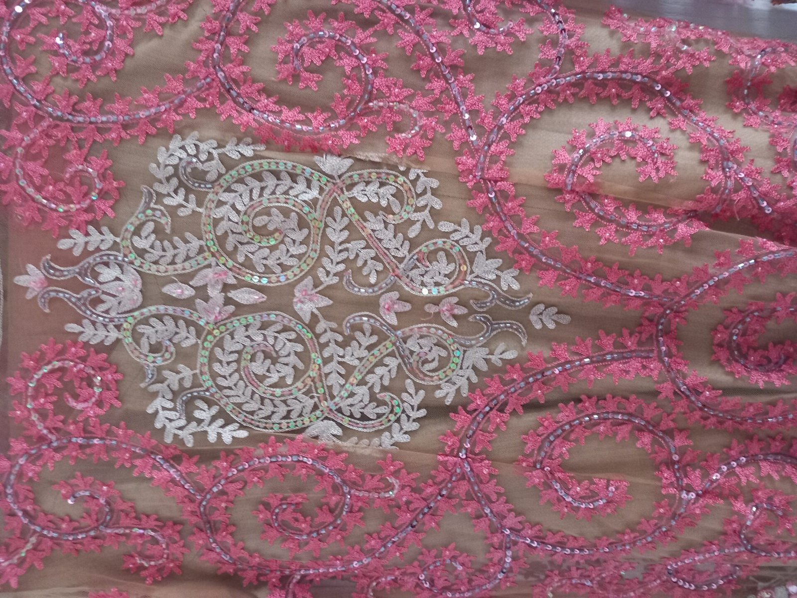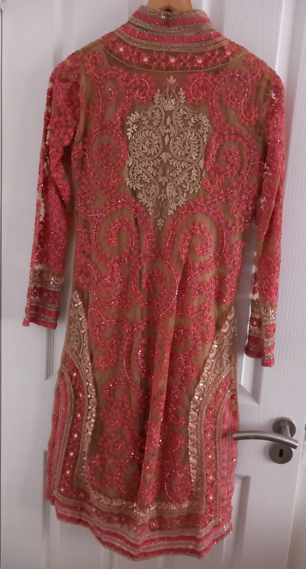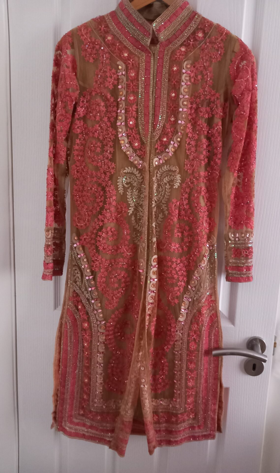 peach pink/salmon 4 pc suit. coat dress in net lace with sequins and embroidery detail.. chemise churidaa and chuni duppta