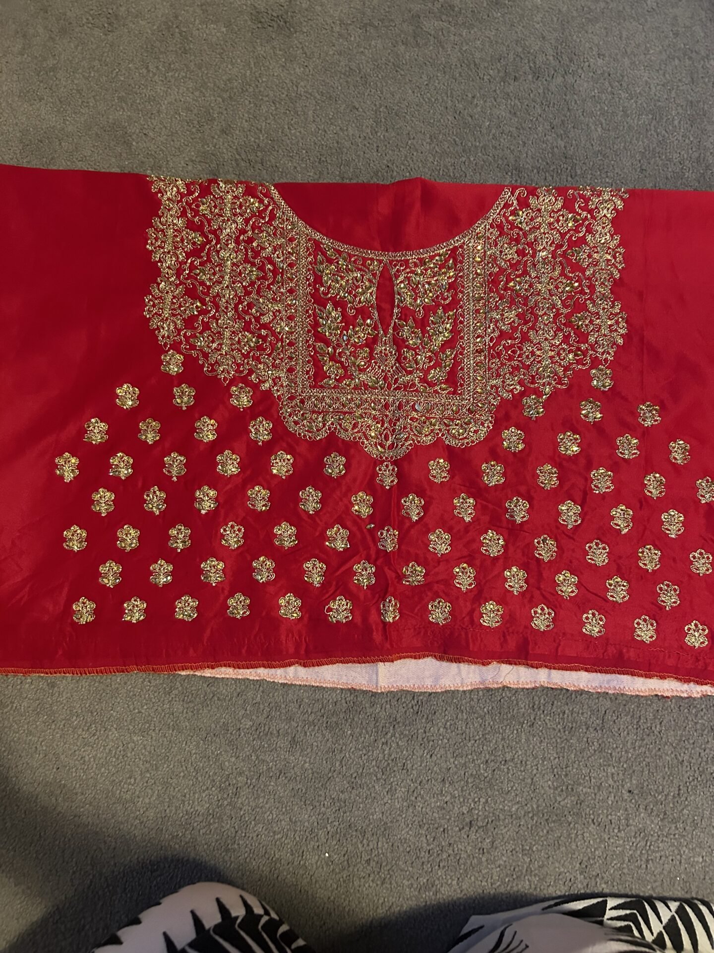 Beautiful red with gold embroidery. Unstitched so can fit all.