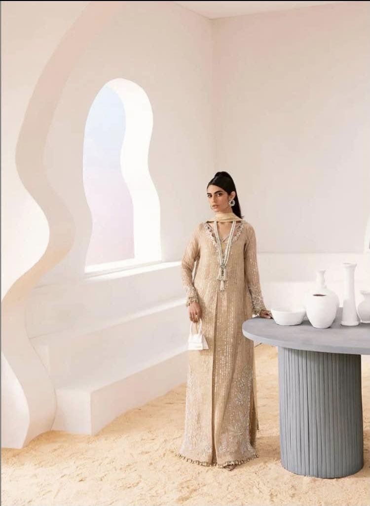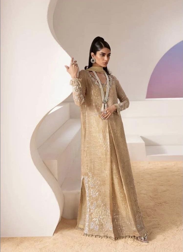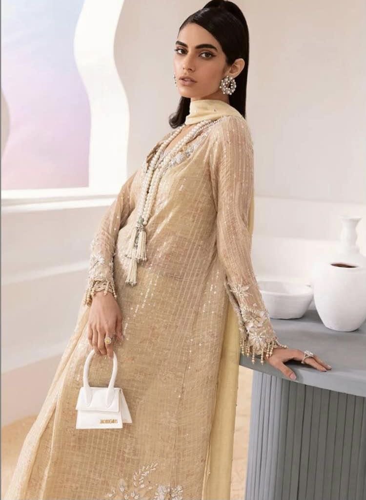 Une Tournesol Impeccable craftsmanship and a modern boxy silhouette Une tournesol rendered in soft Aurelian yellow encrusted with delicate floral hand work. Layered over tonal pants and paired with a modern net dupatta with bead work.An exceptional look to make a bold statement. Shirt: Submation Print Trouser: Raw Silk Dupatta: Rocket Net